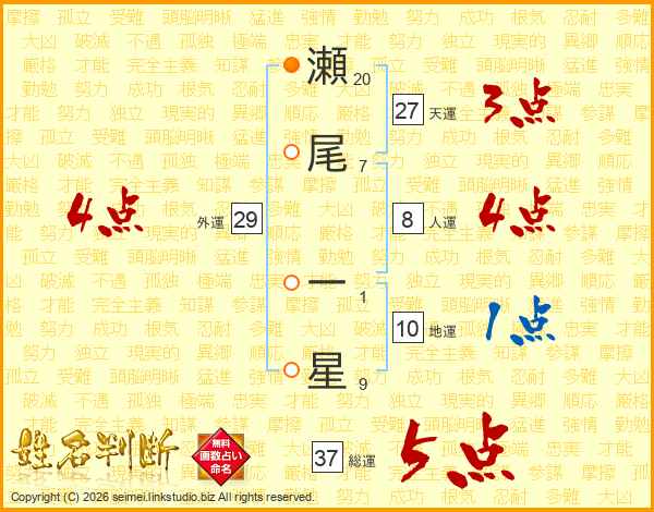 瀬(20画)尾(7画) 一(1画)星(9画)