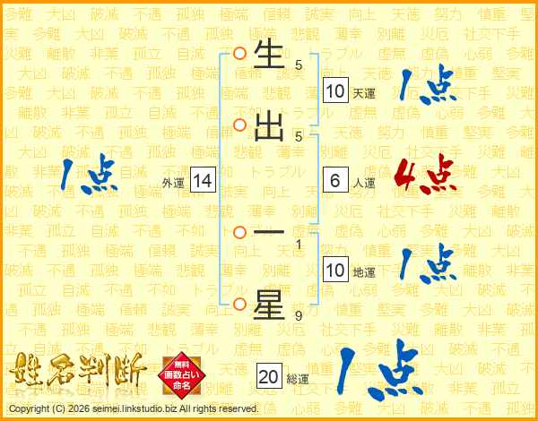 生活面を象徴する運勢です。外部から受ける影響力を表し、結婚運、家庭運や職場、環境への順応性を表します。総運から人運を引いた画数。姓や名が1文字の場合を除く。