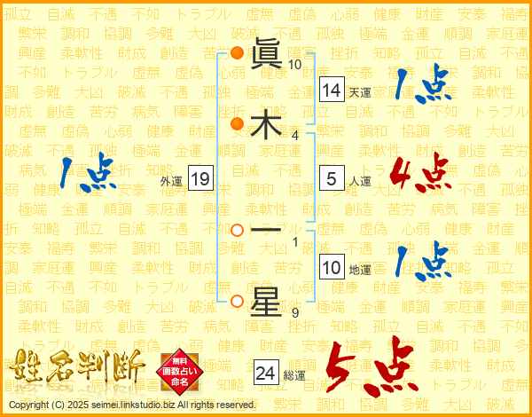生活面を象徴する運勢です。外部から受ける影響力を表し、結婚運、家庭運や職場、環境への順応性を表します。総運から人運を引いた画数。姓や名が1文字の場合を除く。