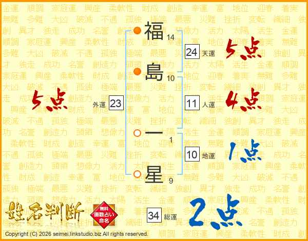生活面を象徴する運勢です。外部から受ける影響力を表し、結婚運、家庭運や職場、環境への順応性を表します。総運から人運を引いた画数。姓や名が1文字の場合を除く。