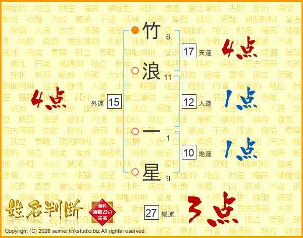 生活面を象徴する運勢です。外部から受ける影響力を表し、結婚運、家庭運や職場、環境への順応性を表します。総運から人運を引いた画数。姓や名が1文字の場合を除く。