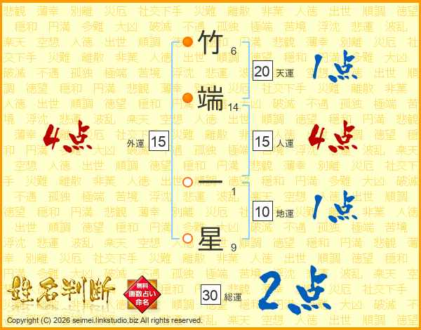 生活面を象徴する運勢です。外部から受ける影響力を表し、結婚運、家庭運や職場、環境への順応性を表します。総運から人運を引いた画数。姓や名が1文字の場合を除く。