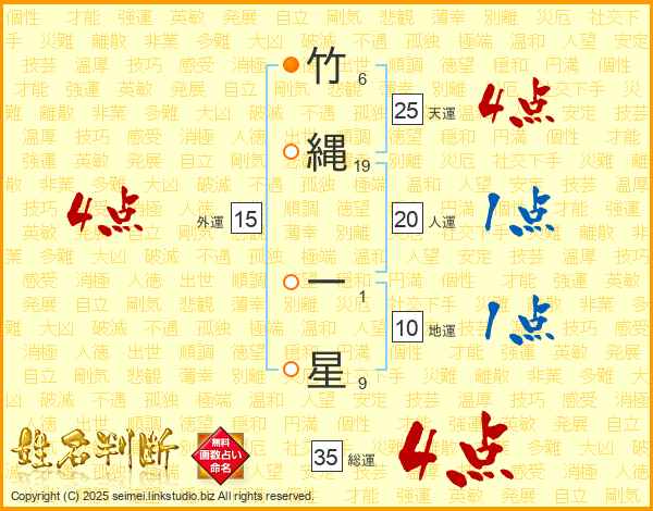 生活面を象徴する運勢です。外部から受ける影響力を表し、結婚運、家庭運や職場、環境への順応性を表します。総運から人運を引いた画数。姓や名が1文字の場合を除く。