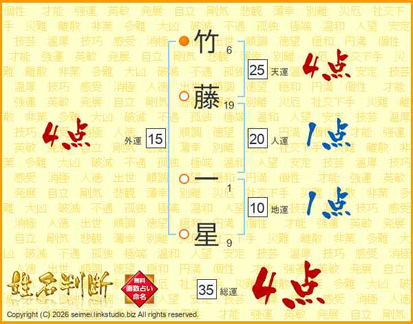 生活面を象徴する運勢です。外部から受ける影響力を表し、結婚運、家庭運や職場、環境への順応性を表します。総運から人運を引いた画数。姓や名が1文字の場合を除く。