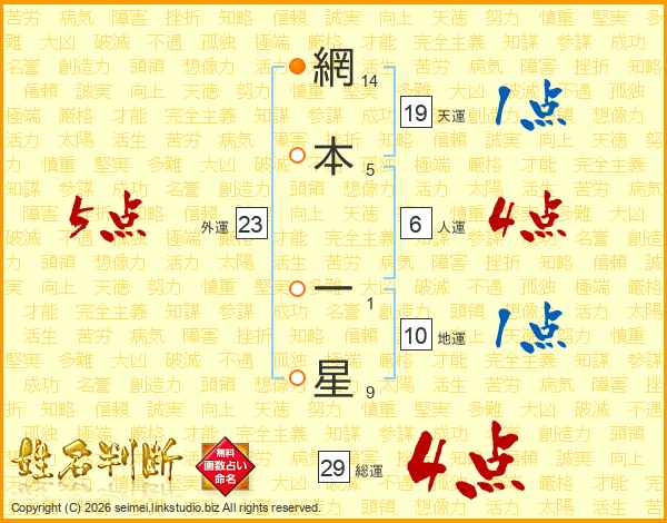 あなたの人生を表す1番重要な運勢です。生涯を通じて影響する総合運となり、主に50歳以降の晩年期に影響を及ぼします。苗字と名前の合計画数。