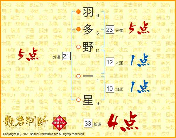 羽多野一星さんの総運は33画の4点!