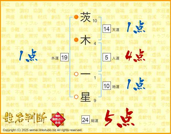 生活面を象徴する運勢です。外部から受ける影響力を表し、結婚運、家庭運や職場、環境への順応性を表します。総運から人運を引いた画数。姓や名が1文字の場合を除く。