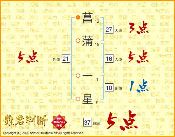 菖(12画)蒲(15画) 一(1画)星(9画)