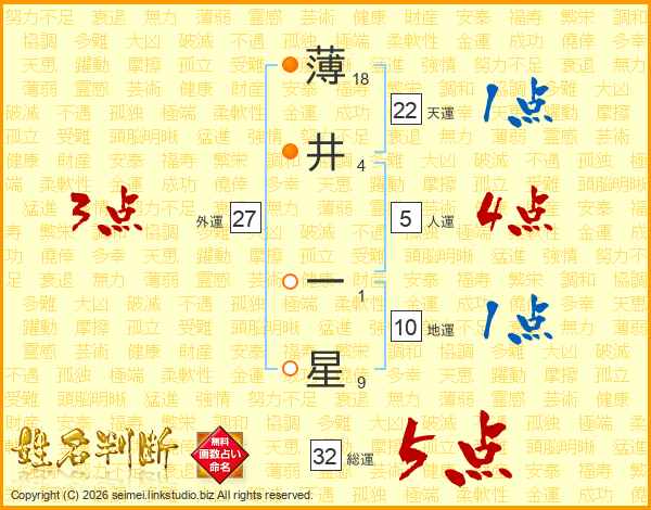 薄井一星さんの総運は32画の5点!