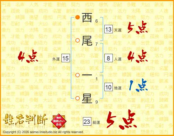 生活面を象徴する運勢です。外部から受ける影響力を表し、結婚運、家庭運や職場、環境への順応性を表します。総運から人運を引いた画数。姓や名が1文字の場合を除く。