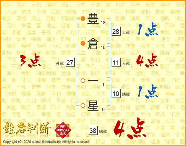 生活面を象徴する運勢です。外部から受ける影響力を表し、結婚運、家庭運や職場、環境への順応性を表します。総運から人運を引いた画数。姓や名が1文字の場合を除く。