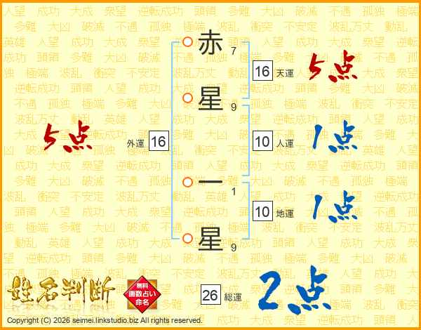 生活面を象徴する運勢です。外部から受ける影響力を表し、結婚運、家庭運や職場、環境への順応性を表します。総運から人運を引いた画数。姓や名が1文字の場合を除く。