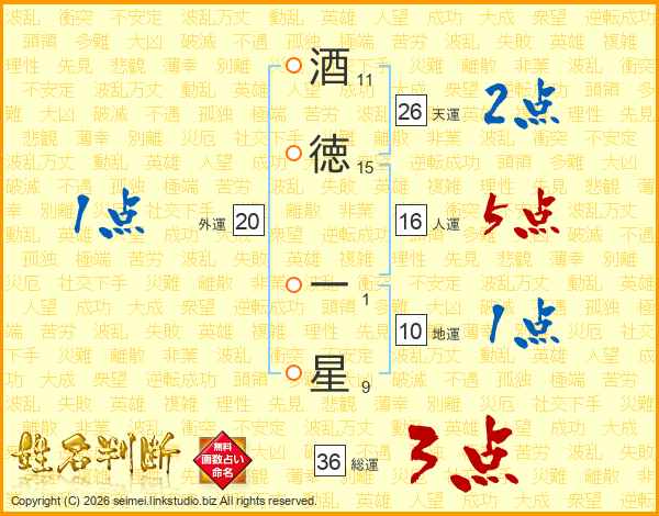 あなたの人生を表す1番重要な運勢です。生涯を通じて影響する総合運となり、主に50歳以降の晩年期に影響を及ぼします。苗字と名前の合計画数。
