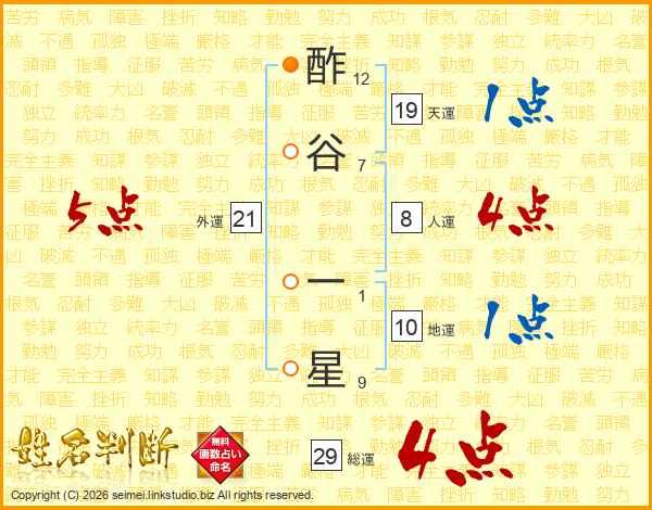 生活面を象徴する運勢です。外部から受ける影響力を表し、結婚運、家庭運や職場、環境への順応性を表します。総運から人運を引いた画数。姓や名が1文字の場合を除く。