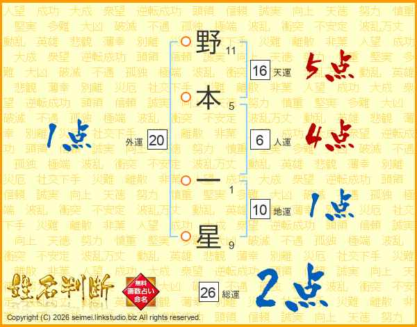 あなたの人生を表す1番重要な運勢です。生涯を通じて影響する総合運となり、主に50歳以降の晩年期に影響を及ぼします。苗字と名前の合計画数。