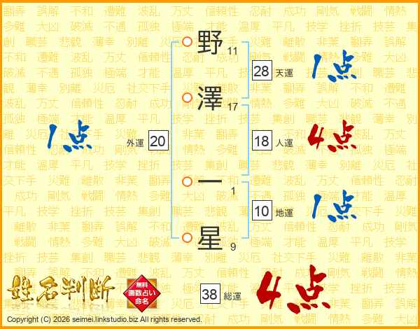 生活面を象徴する運勢です。外部から受ける影響力を表し、結婚運、家庭運や職場、環境への順応性を表します。総運から人運を引いた画数。姓や名が1文字の場合を除く。