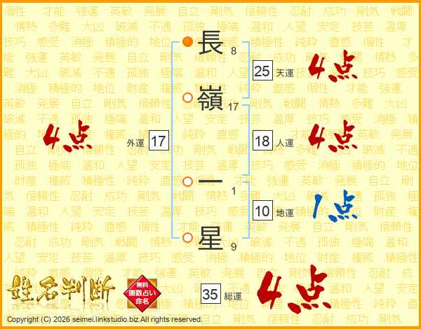 長(8画)嶺(17画) 一(1画)星(9画)