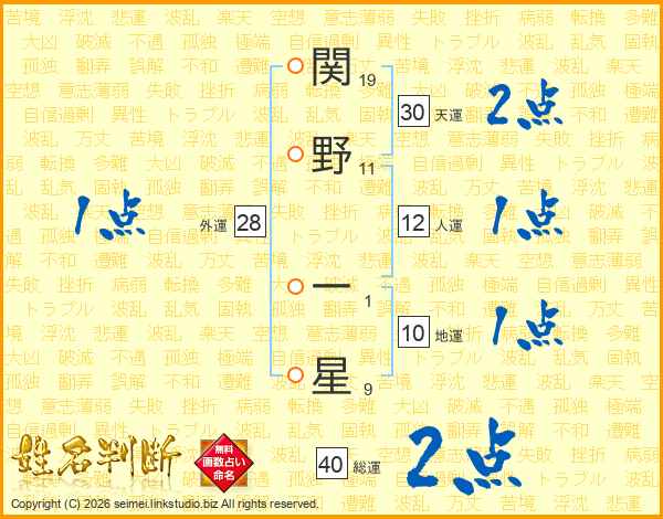 生活面を象徴する運勢です。外部から受ける影響力を表し、結婚運、家庭運や職場、環境への順応性を表します。総運から人運を引いた画数。姓や名が1文字の場合を除く。