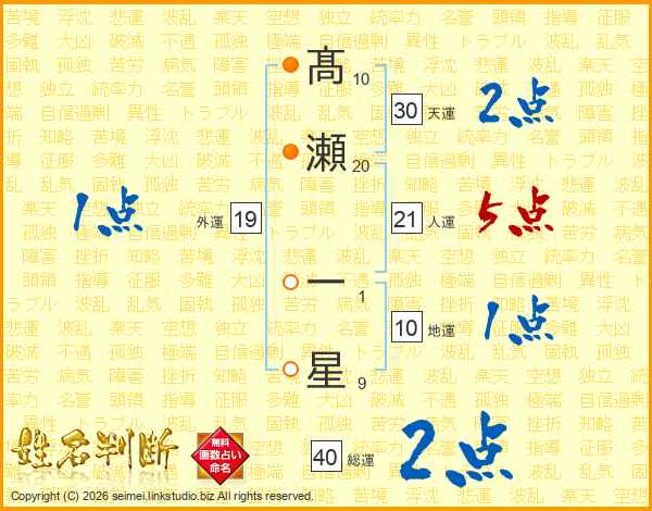髙(10画)瀬(20画) 一(1画)星(9画)