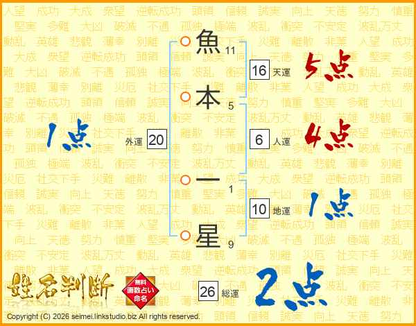 生活面を象徴する運勢です。外部から受ける影響力を表し、結婚運、家庭運や職場、環境への順応性を表します。総運から人運を引いた画数。姓や名が1文字の場合を除く。