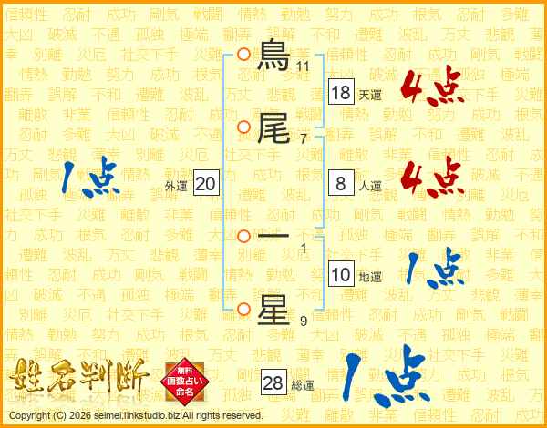 鳥(11画)尾(7画) 一(1画)星(9画)