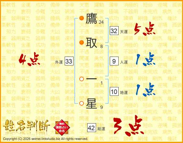生活面を象徴する運勢です。外部から受ける影響力を表し、結婚運、家庭運や職場、環境への順応性を表します。総運から人運を引いた画数。姓や名が1文字の場合を除く。