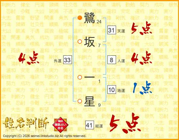鷺坂一星さんの総運は41画の5点!