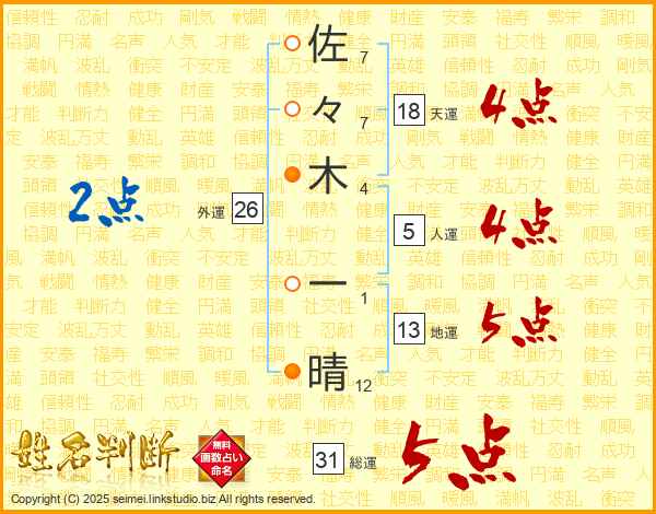 佐(7画)々(7画)木(4画) 一(1画)晴(12画)