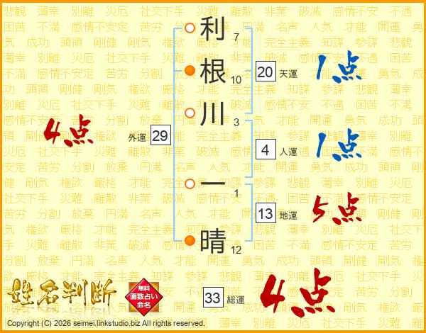 利根川一晴さんの総運は33画の4点!