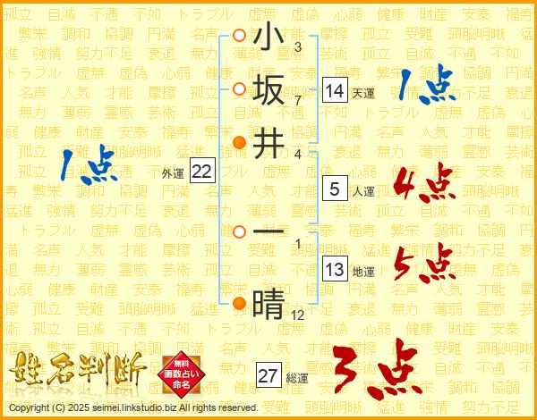 小(3画)坂(7画)井(4画) 一(1画)晴(12画)