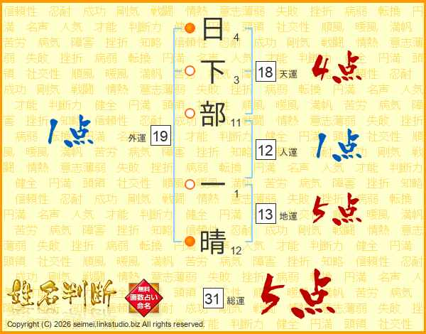 日(4画)下(3画)部(11画) 一(1画)晴(12画)