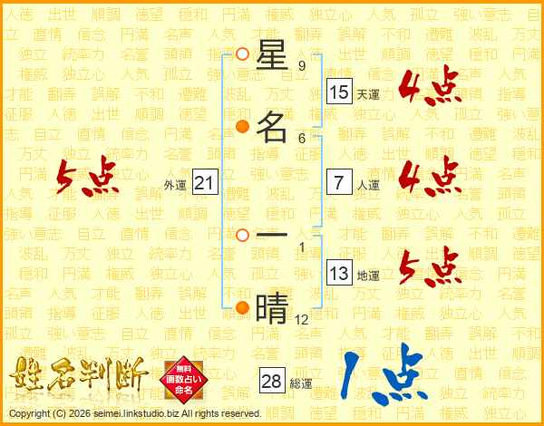 生活面を象徴する運勢です。外部から受ける影響力を表し、結婚運、家庭運や職場、環境への順応性を表します。総運から人運を引いた画数。姓や名が1文字の場合を除く。
