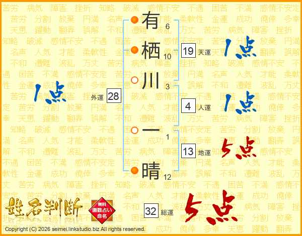 生活面を象徴する運勢です。外部から受ける影響力を表し、結婚運、家庭運や職場、環境への順応性を表します。総運から人運を引いた画数。姓や名が1文字の場合を除く。