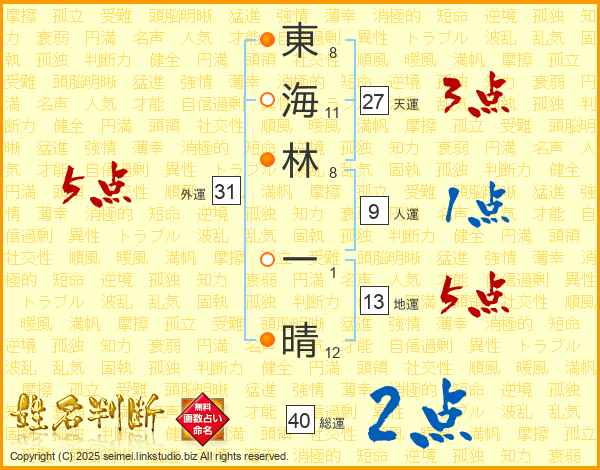 東(8画)海(11画)林(8画) 一(1画)晴(12画)