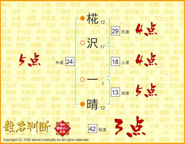 椛沢一晴さんの天運は29画の4点!