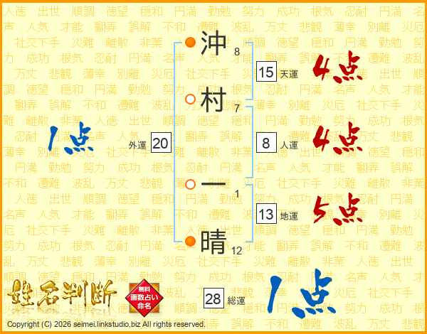 生活面を象徴する運勢です。外部から受ける影響力を表し、結婚運、家庭運や職場、環境への順応性を表します。総運から人運を引いた画数。姓や名が1文字の場合を除く。