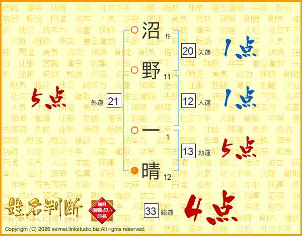 沼野一晴さんの総運は33画の4点!