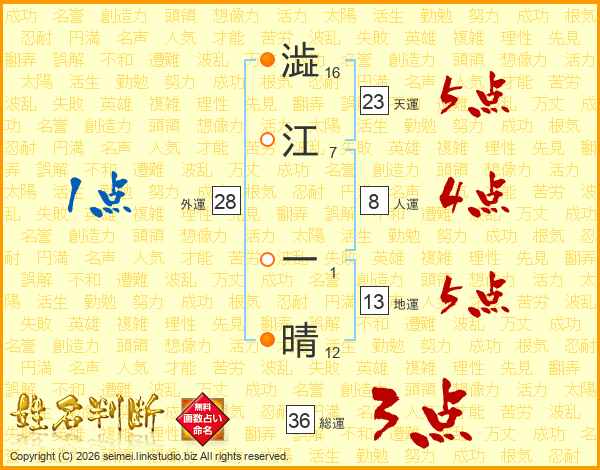 生活面を象徴する運勢です。外部から受ける影響力を表し、結婚運、家庭運や職場、環境への順応性を表します。総運から人運を引いた画数。姓や名が1文字の場合を除く。