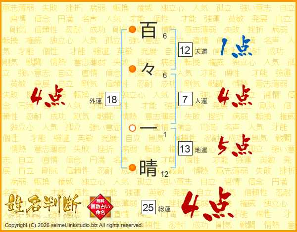 百々一晴さんの総運は25画の4点!