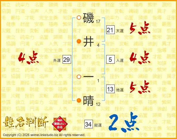 生活面を象徴する運勢です。外部から受ける影響力を表し、結婚運、家庭運や職場、環境への順応性を表します。総運から人運を引いた画数。姓や名が1文字の場合を除く。