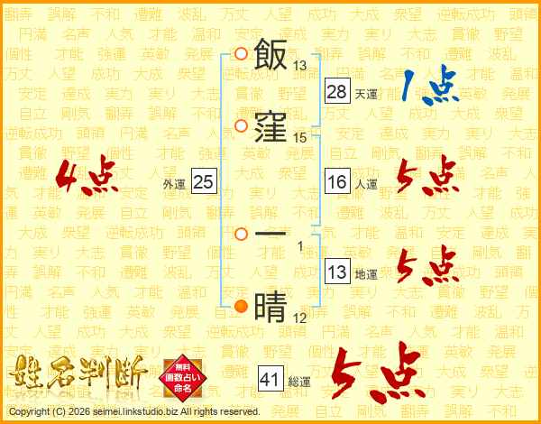 飯(13画)窪(15画) 一(1画)晴(12画)