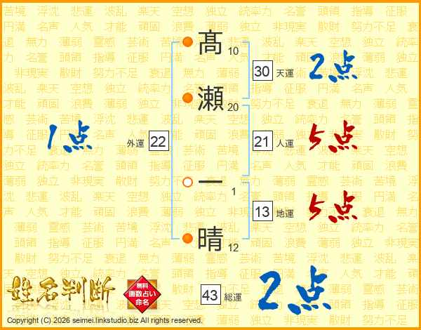 髙(10画)瀬(20画) 一(1画)晴(12画)