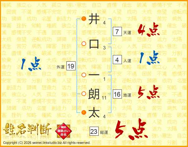 井(4画)口(3画) 一(1画)朗(11画)太(4画)