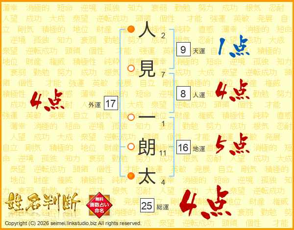 人(2画)見(7画) 一(1画)朗(11画)太(4画)