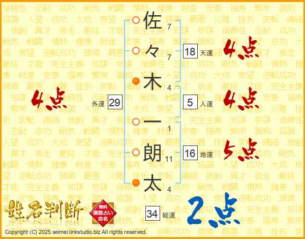 佐(7画)々(7画)木(4画) 一(1画)朗(11画)太(4画)