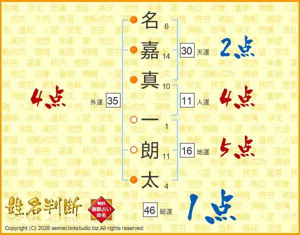 名(6画)嘉(14画)真(10画) 一(1画)朗(11画)太(4画)