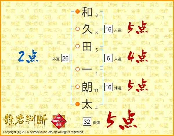和(8画)久(3画)田(5画) 一(1画)朗(11画)太(4画)