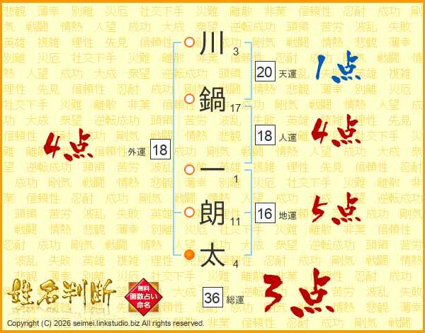 川(3画)鍋(17画) 一(1画)朗(11画)太(4画)