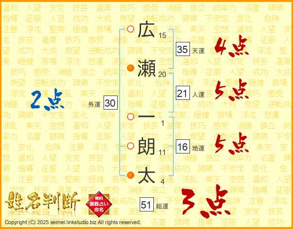 広(15画)瀬(20画) 一(1画)朗(11画)太(4画)