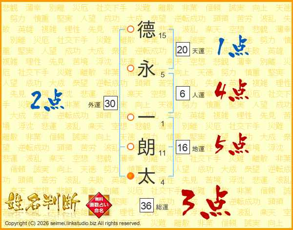 德(15画)永(5画) 一(1画)朗(11画)太(4画)